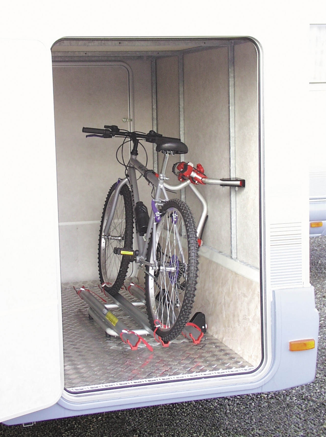 Fietsenrek geschikt voor campers met garage ruimte. Het rek wordt aan de onderkant vastgezet. Met wandbeugel voor het vastzetten van de fietsen.