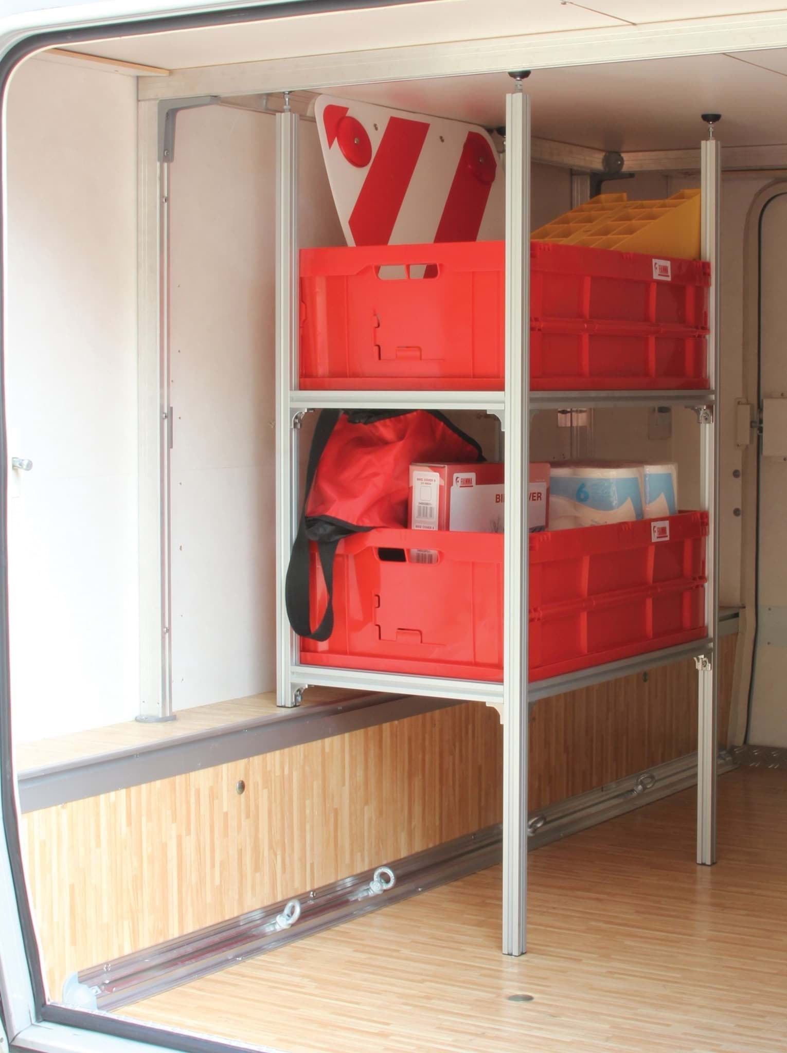 U heeft de mogelijkheid om de stellingen te voorzien van stevige, rode kratten. Per set te bestellen en bestaat uit drie opvouwbare opbergboxen inclusief schroeven om de boxen vast te zetten aan de dragers van de stelling zodat de boxen er niet af kunnen vallen of verschuiven tijdens het rijden. Wanneer u echter de boxen tijdens verblijf of thuis wilt gebruiken is het beter om de boxen los te gebruiken.